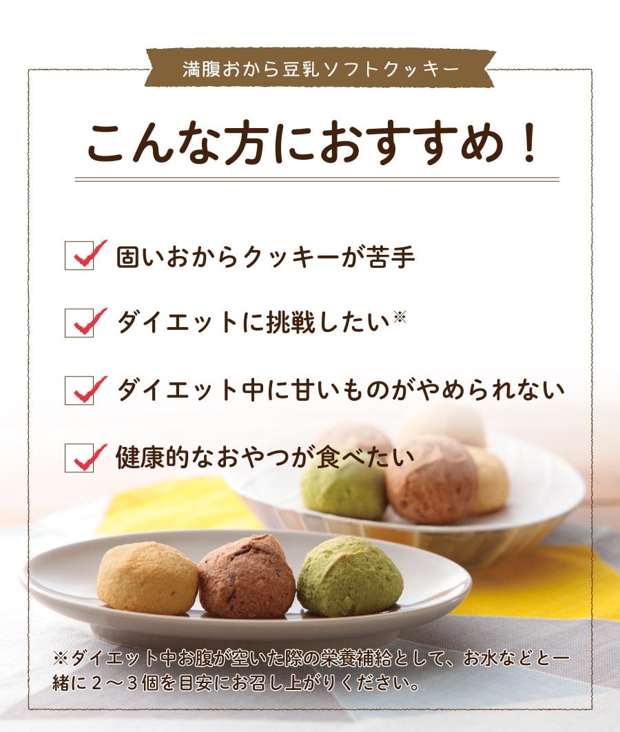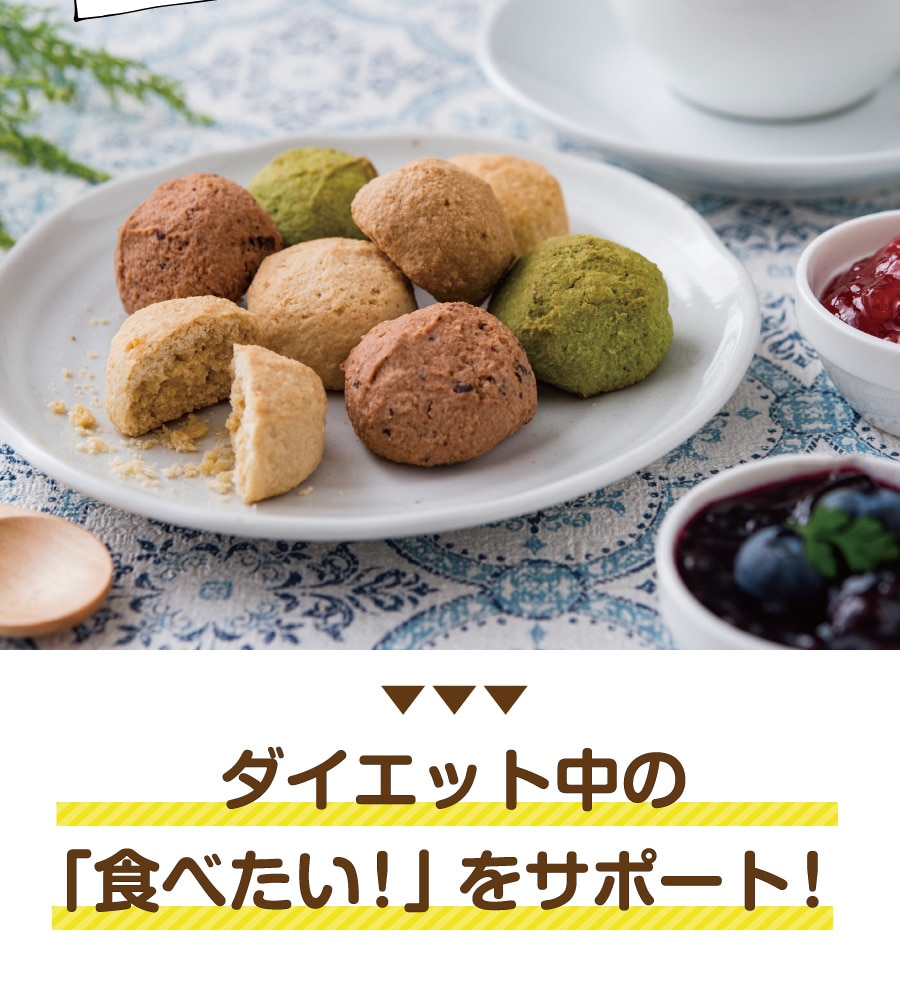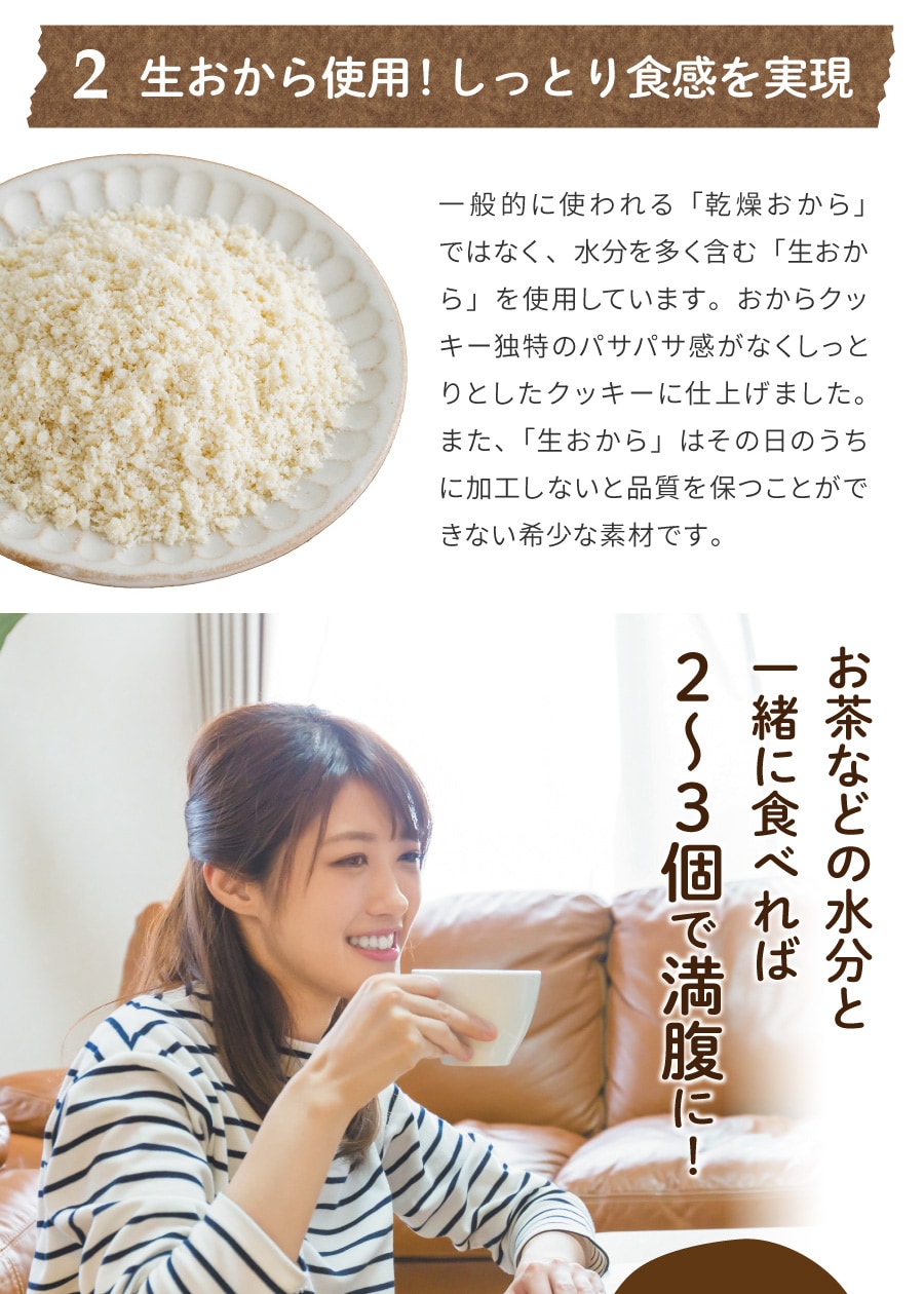 | 原材料 | おから(国内製造)、小麦粉(小麦(国産))、アーモンドパウダー、豆乳、食用こめ油、砂糖(てんさい(国産))、各パウダー(紅茶、ココア、紫いも、ほうれん草)、塩/ベーキングパウダー ■アレルギー物質/大豆・小麦・アーモンド |