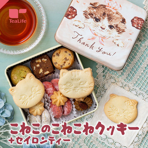 《猫デザインのクッキー缶》こねこのこねこねクッキー + セイロンティーダージリンブレンド ( ギフト バレンタイン ホワイトデー 猫の日 スイーツ かわいい 可愛い ねこ好き 友達 友だち 女性 誕生日 プレゼント 特別セット 化粧箱入り 送料無料 ティーライフ )