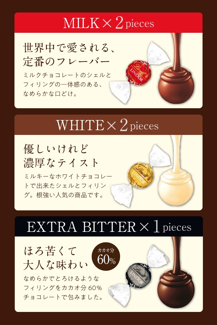 ■内容量:14個入(ミルク6個、ヘーゼルナッツ・エキストラビター各4個) ■原材料:【ミルク】砂糖、植物油脂、ココアバター、全粉乳、カカオマス、乳糖、バターオイル、脱脂粉乳、麦芽エキス/植物レシチン(大豆由来)、香料 【ヘーゼルナッツ】砂糖、植物油脂、ココアバター、カカオマス、全粉乳、ヘーゼルナッツ(4%使用)、乳糖、バターオイル、脱脂粉乳、麦芽エキス/植物レシチン(大豆由来)、香料 【エキストラビター】カカオマス、砂糖、植物油脂、ココアバター、バターオイル、全粉乳、脱脂粉乳、乳糖、バニラビーンズ、麦芽エキス/植物レシチン(大豆由来)、香料 ■アレルギー物質/乳成分、大豆 ※アーモンド、ヘーゼルナッツを使用した設備で製造しています。 ■カロリー:100g当たりミルク628kcal、ヘーゼルナッツ636kcal、エキストラビター651kcal |