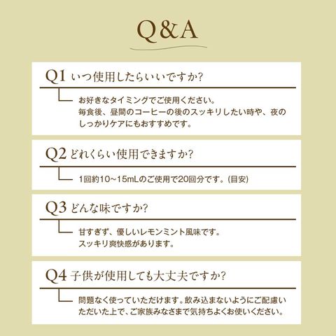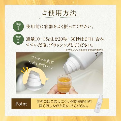 【使用方法】 使用前に容器をよく振ってください。適量10~15mLを20~30秒ほど口に含み、すすいだ後、ブラッシングしてください。 ■1回約10~15mLのご使用で20回分(目安) 【ご使用上の注意】 ●内服液ではありませんので、飲まないでください。●用法・用量に従いご使用ください。●口中に傷等の異常がある時は使用しないでください。●口中に発しん、かゆみ、はれ等の異常や強いせいこみ等の症状があらわれたときは使用を中止し、医師にご相談ください。●目に入らないように注意し、入ったときは直ちに洗い流してください。異物感が残る場合は、眼科医にご相談ください。 【保管および取り扱い上の注意】 ●使用後はキャップをしっかり閉めて保管してください。●キャップは清潔に保ってください。●乳幼児の手の届かない所に保管してください。●極端に高温や低温の場所、直射日光の当たる場所には保管しないでください。●天然由来成分を配合しているため、製品により多少色・味等が異なる場合がありますが、ご使用には問題ありません。また、沈殿が生じることがあります。 |
