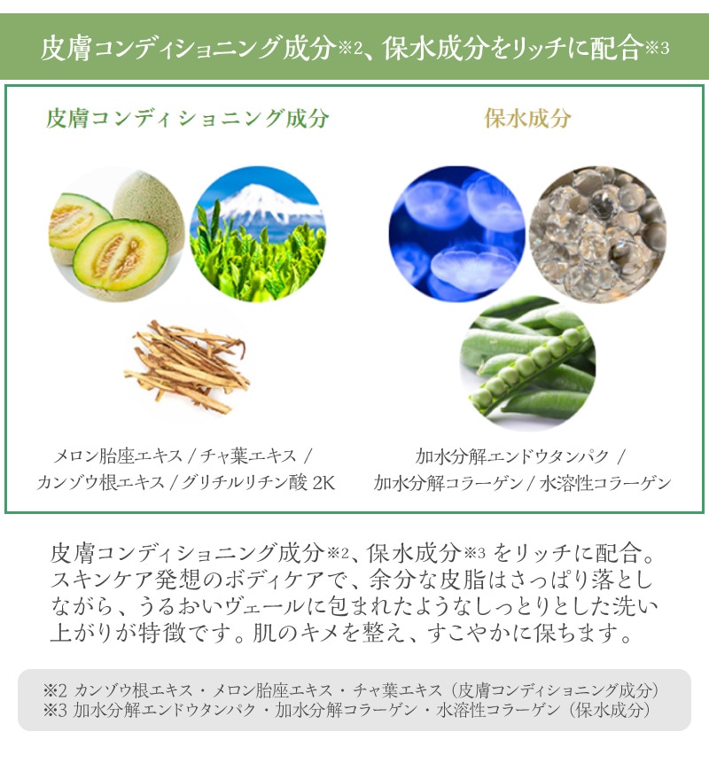 | 全成分 | 水、コカミドプロピルベタイン、ラウラミドプロピルベタイン、ラウレス-6カルボン酸Na、ココイルグリシンK、ラウラミドDEA、ラウリン酸ポリグリセリル-10、デシルグルコシド、塩化Na、ラウロイルメチルアラニンNa、チャ種子油、ヒアルロン酸ヒドロキシプロピルトリモニウム、ジヒドロキシプロピルアルギニンHCl、加水分解エンドウタンパク、加水分解コラーゲン、水溶性コラーゲン、ユズ果実エキス、メロン胎座エキス、チャ葉エキス、カンゾウ根エキス、グリチルリチン酸2K、オレンジ果皮油、ユーカリ葉油、グリセリン、BG、ペンチレングリコール、カプリル酸グリセリル、ポリクオタニウム-50、ラウラミドプロピルヒドロキシスルタイン、コカミドDEA、コカミドメチルMEA、ヤシ脂肪酸K、ペンテト酸5Na、EDTA-2Na、フィチン酸、クエン酸、クエン酸Na、アスコルビン酸、ポリソルベート80、酸化銀、フェノキシエタノール |
