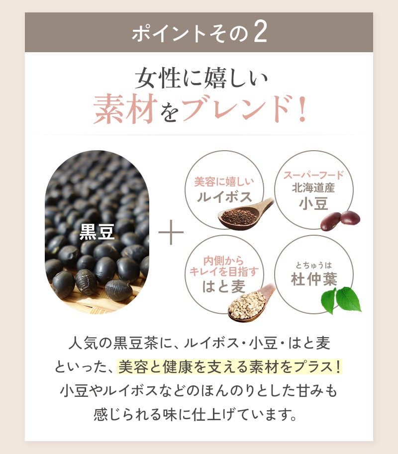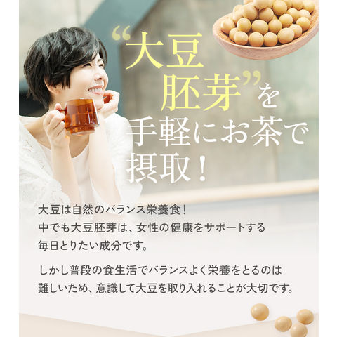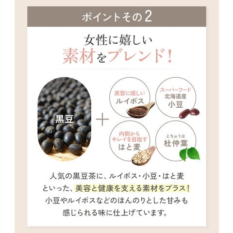 | 原材料 | 黒豆[大豆](アメリカ・国産)、大豆胚芽(国内製造)、小豆(国産)、ルイボス(南アフリカ共和国)、杜仲葉(中国)、はとむぎ(タイ)、大豆胚芽抽出物(国内製造)/環状オリゴ糖 ■アレルギー物質:大豆 |