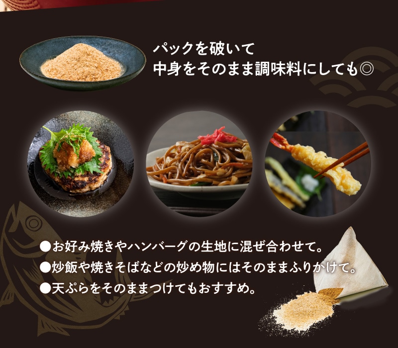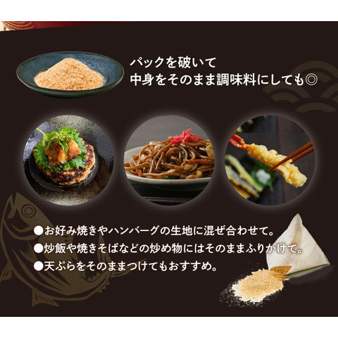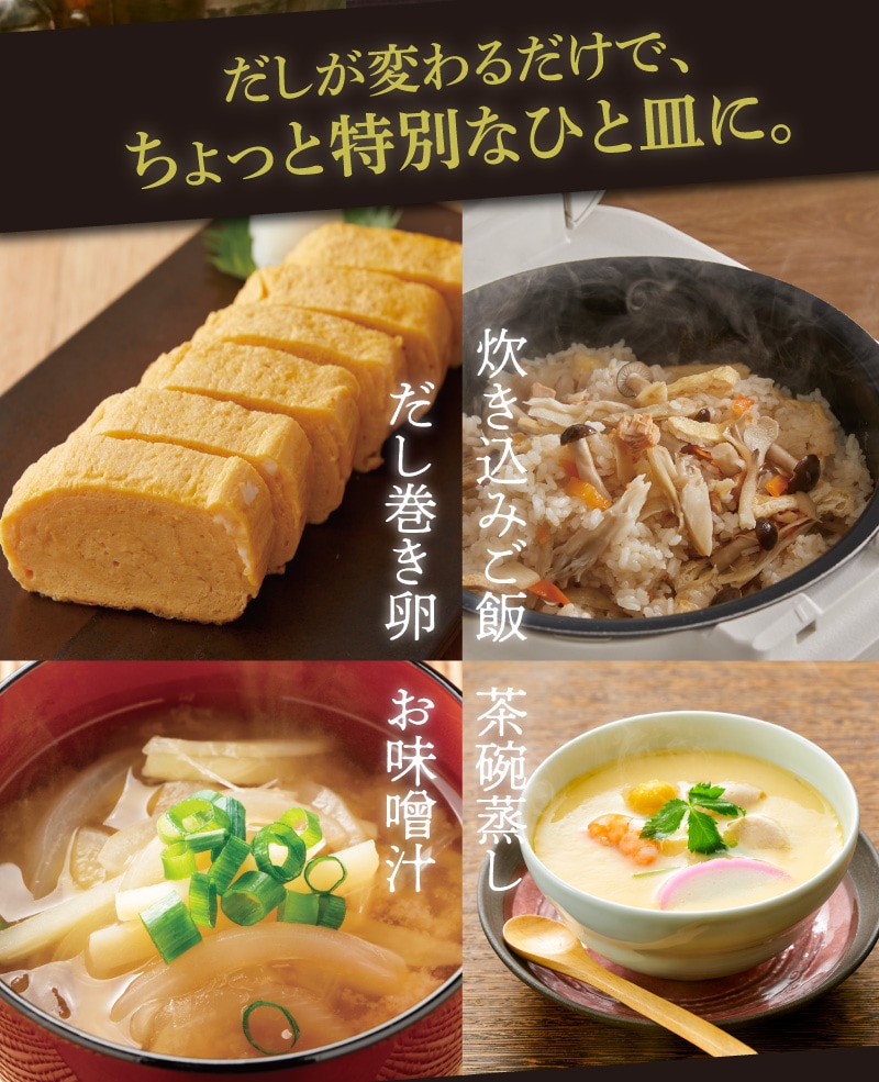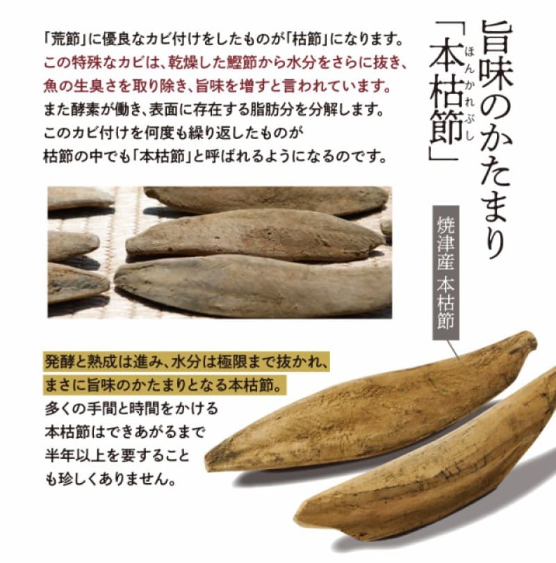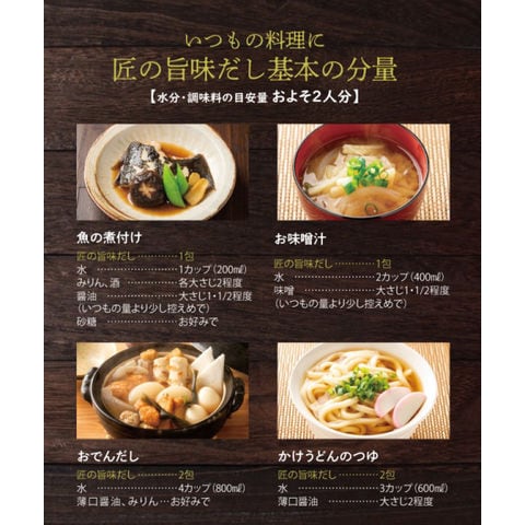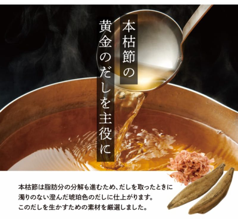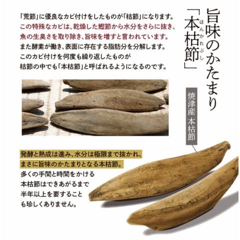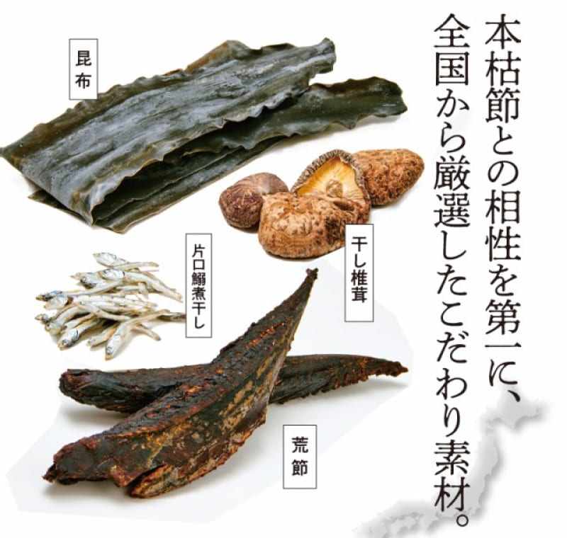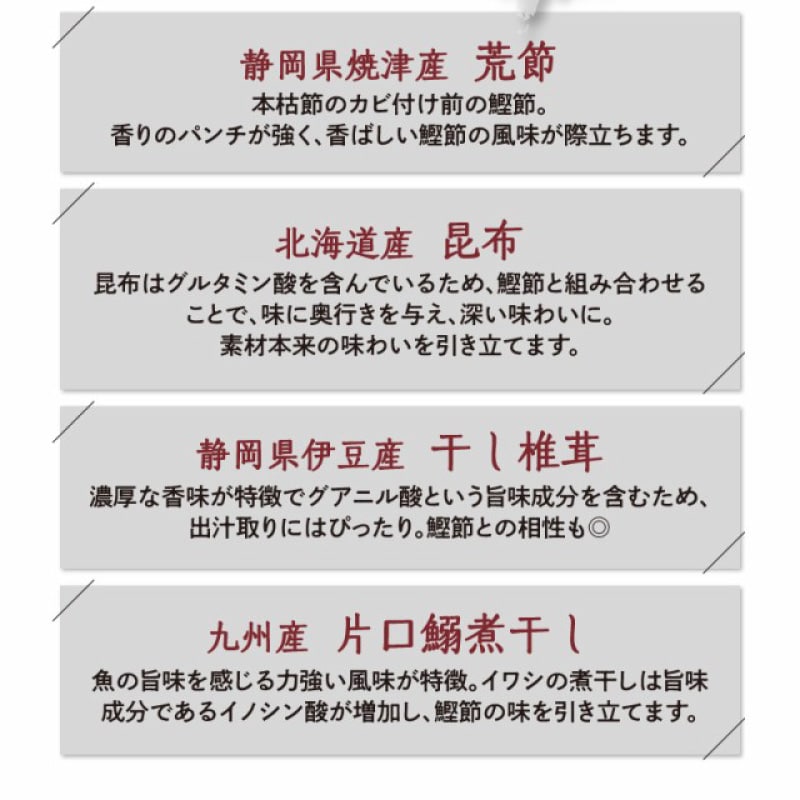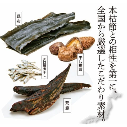 | 原材料 | 風味原料(かつおかれぶし削りぶし、煮干いわし、鰹節エキス、鰹節粉末、昆布、乾燥椎茸)(国内製造)、でん粉分解物、酵母エキス、食塩、醤油、発酵調味料(一部に小麦・大豆を含む) ■アレルギー物質/小麦、大豆 |