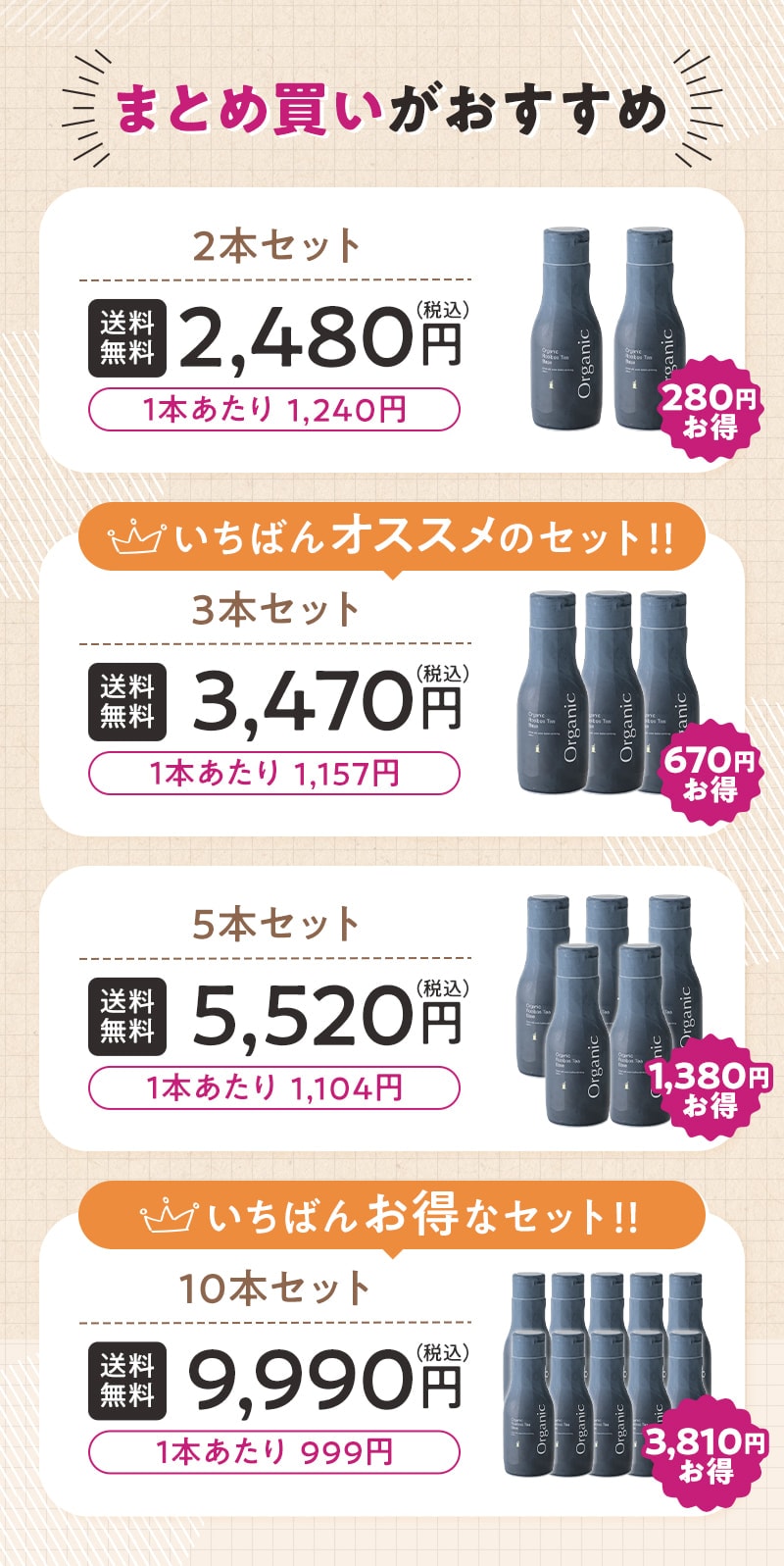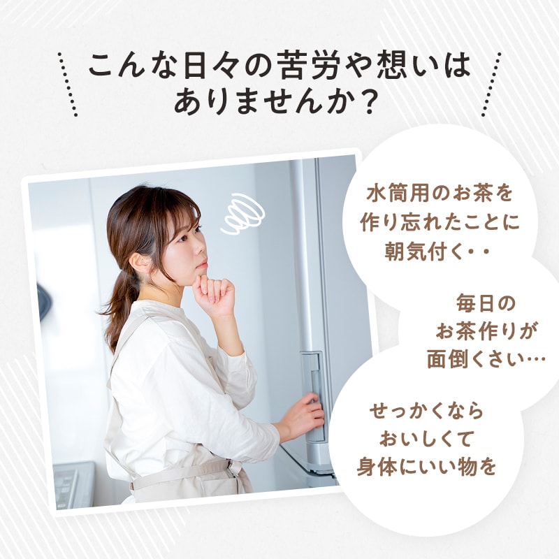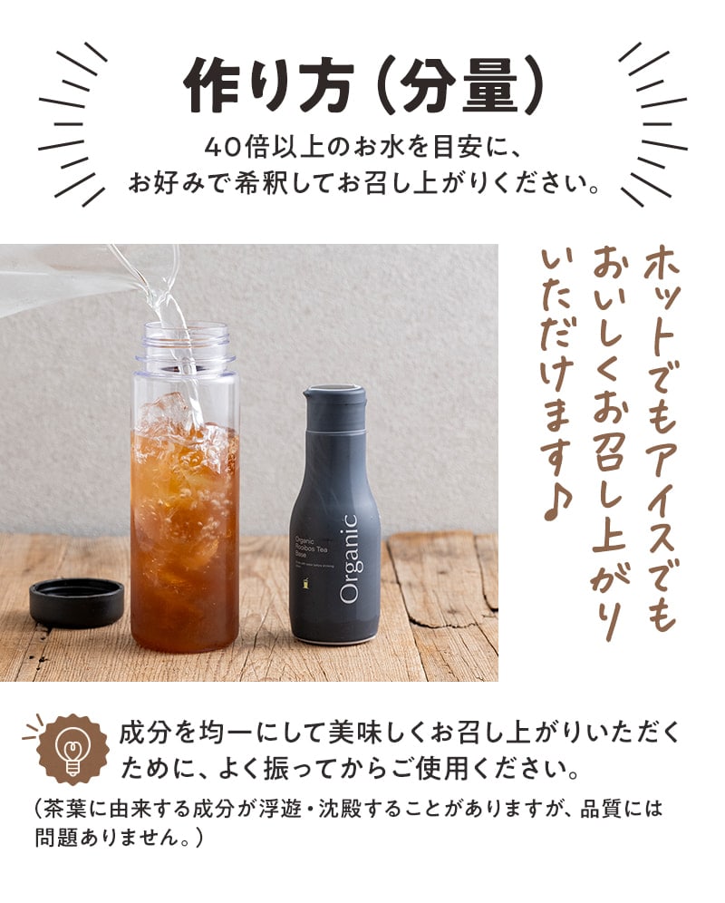 40倍以上のお水を目安に、お好みで希釈してお召し上がりください。 ※成分を均一に美味しくお召し上がりいただくために、良く振ってからご使用ください。 ※茶葉に由来する成分が浮遊・沈殿することがありますが、品質には問題ありません。 |