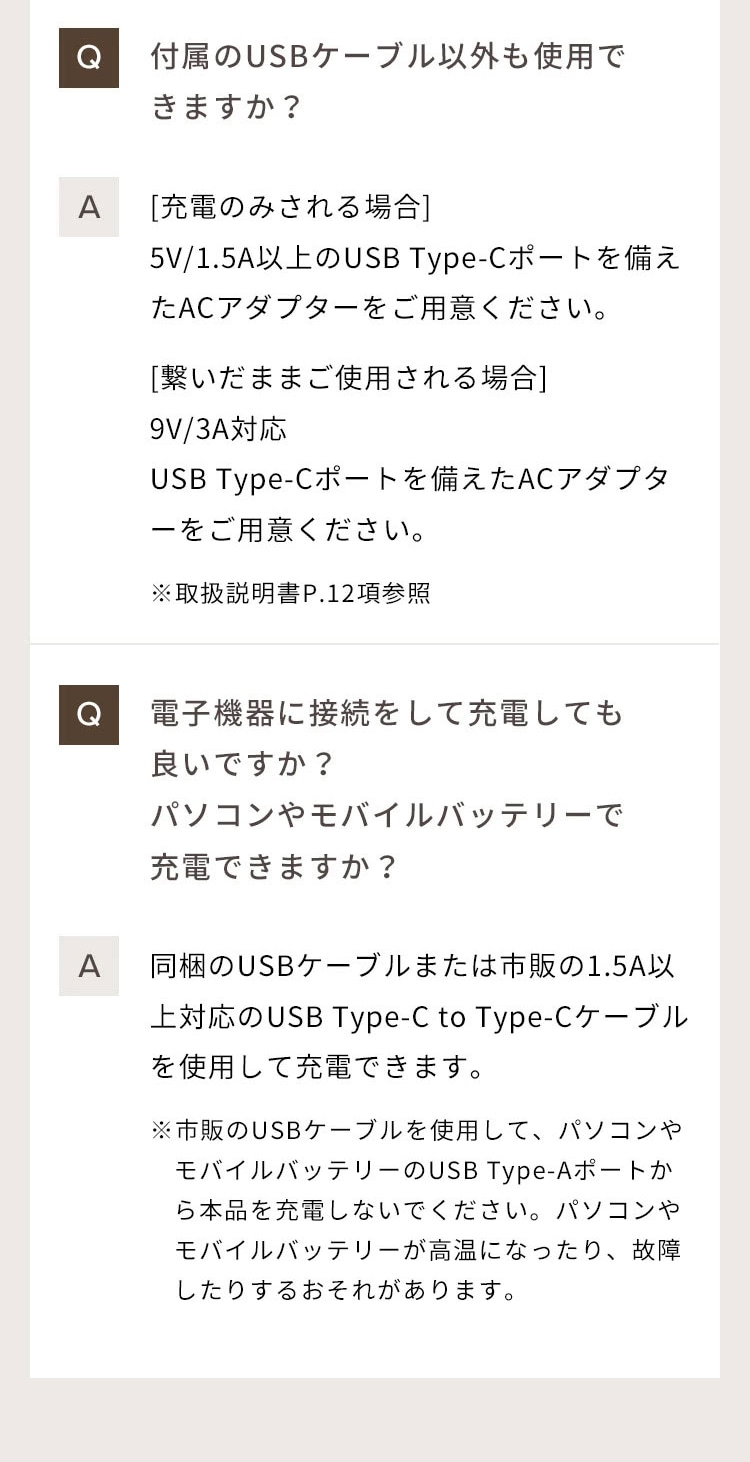 | 電源方式 | 充電式、ACアダプタ給電式 |