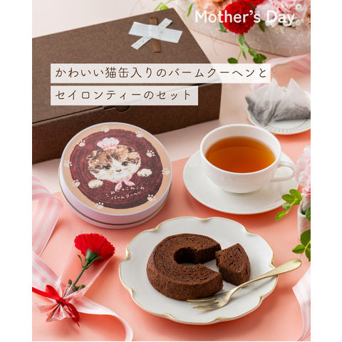 【母の日 2026】《猫デザイン缶》こねこのこねこねバウムクーヘン+ セイロンティーダージリンブレンド ( ギフト スイーツ かわいい 可愛い ねこ好き 化粧箱入り 母の日ギフト お母さん 感謝 ありがとう プレゼント 送料無料 ティーライフ )
