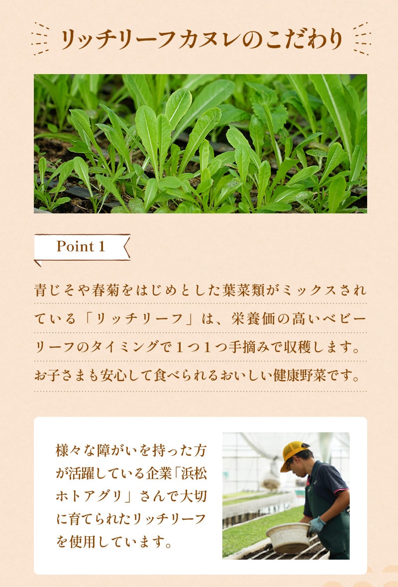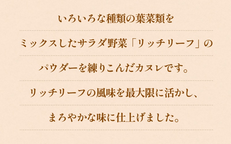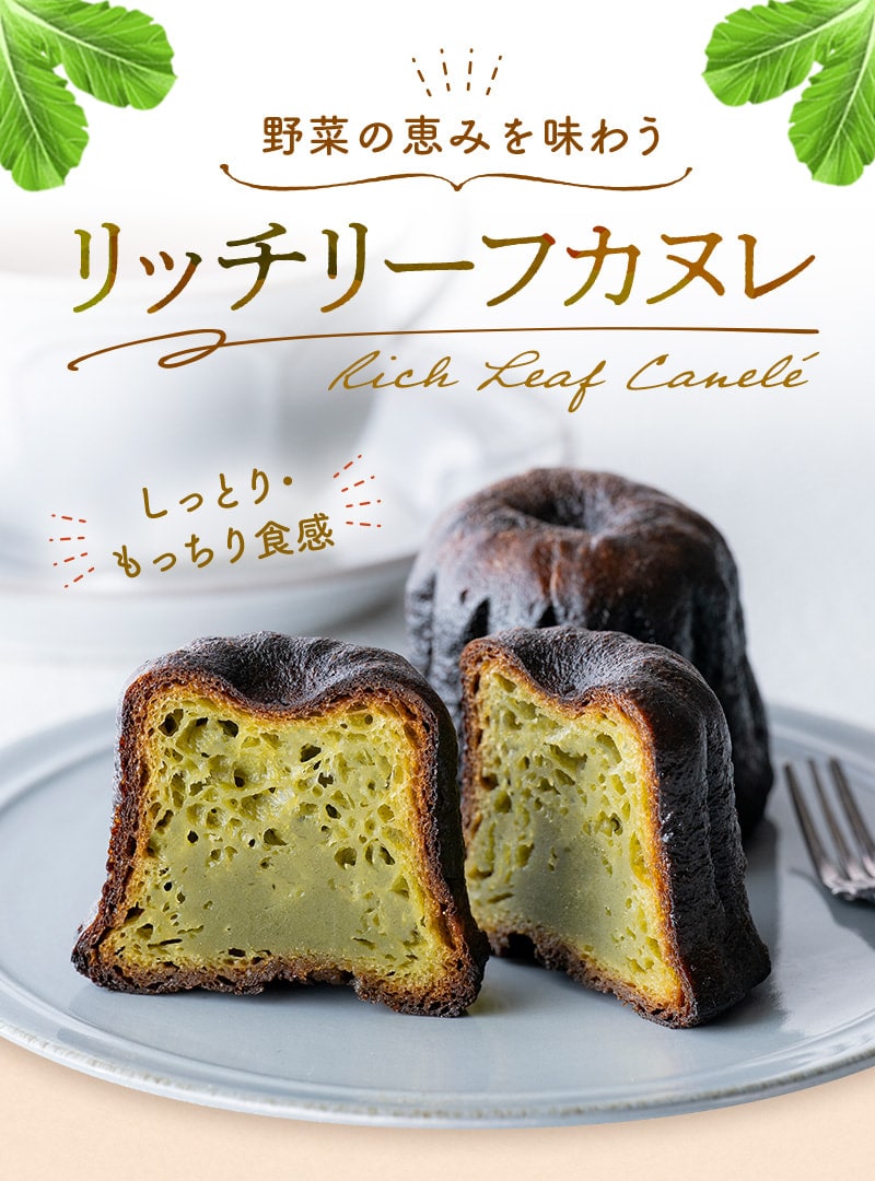 【リッチリーフカヌレ】 ●内容量:1個45g×3個 ●原材料:牛乳(静岡県産)、砂糖、卵(静岡県産)、小麦粉、ベビーリーフパウダー(静岡県産)、バター、洋酒、(卵・乳成分・小麦を含む) ■アレルギー物質/卵、乳成分、小麦 ●賞味期限:2026年2月4日 |