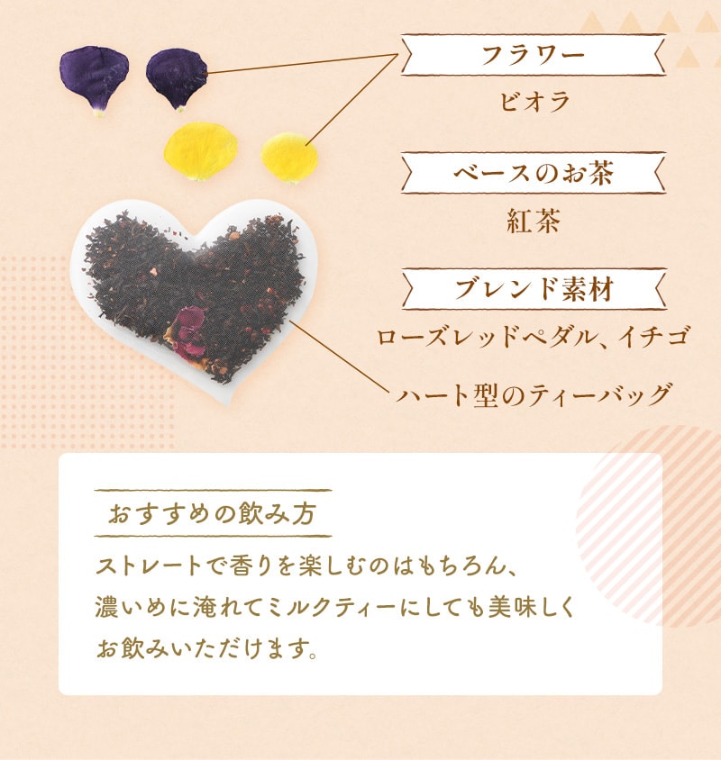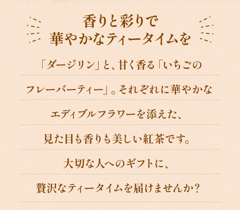 【エディブルフラワー紅茶(ダージリン)】 ●内容量:2g×1個 ●原材料:ダージリン(インド)、食用花(キンギョソウ) ●賞味期限:2026年4月 【エディブルフラワー紅茶(ストロベリー) ●内容量:2g×1個 ●原材料:紅茶(インド)、いちご、ローズレッドペタル、食用花(ビオラ)/香料 ●賞味期限:2026年4月 |