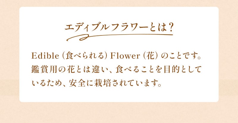エディブルフラワーは自然のものですので、サイズ色にはバラつきがございます。小さな花びらも入っております。ご了承くださいませ。 |