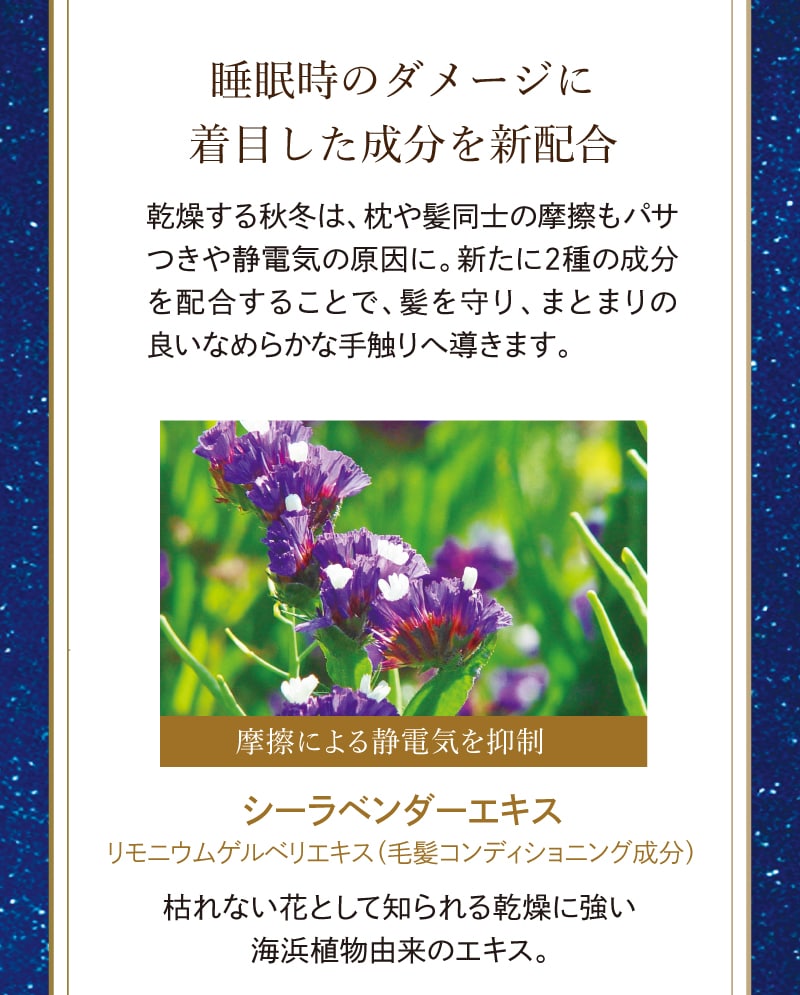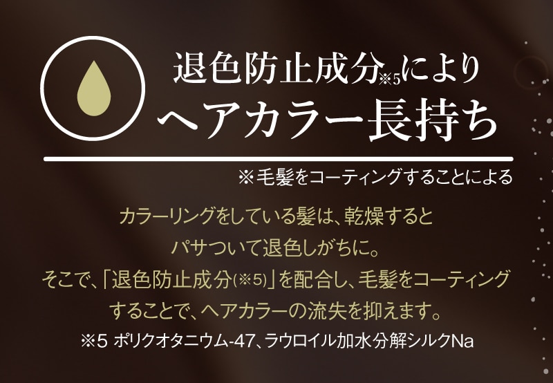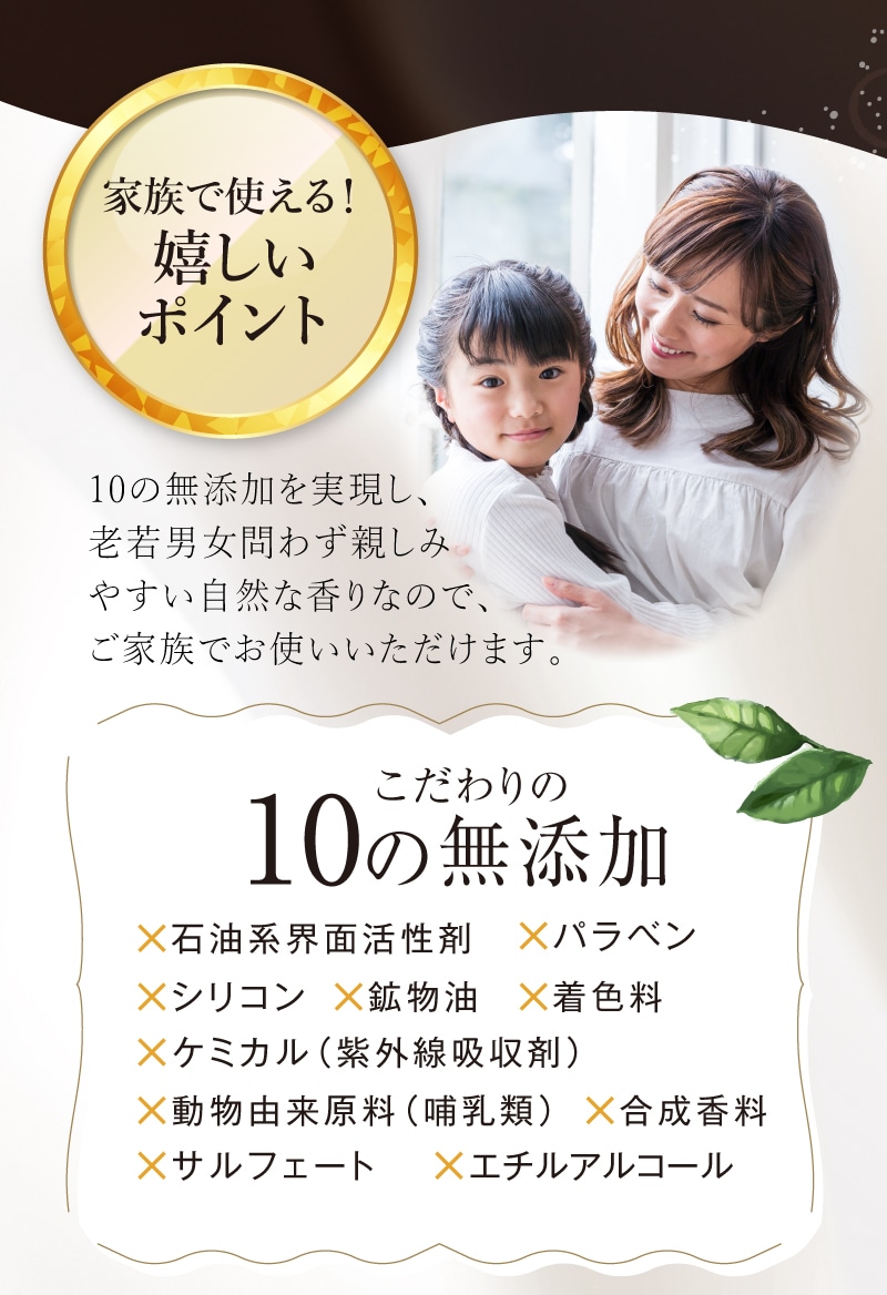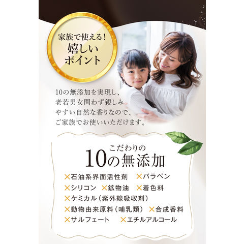 全成分 水、ココイルグルタミン酸TEA、ラウラミドDEA、ココイルメチルタウリンNa、ラウラミドプロピルベタイン、ラウロイルメチルアラニンNa、コカミドプロピルベタイン、チャ種子油、スクワラン、ホホバ種子油、ラウロイル加水分解シルクNa、加水分解コメタンパク、リモニウムゲルベリエキス、月見草油、アルガニアスピノサ核油、ハチミツ、γ-ドコサラクトン、セバシン酸ジエチル、コメヌカスフィンゴ糖脂質、スフィンゴ糖脂質、ウメ果実エキス、モモ葉エキス、ポリクオタニウム-10、ポリクオタニウム-7、ポリクオタニウム-47、加水分解シルク、ヒアルロン酸ヒドロキシプロピルトリモニウム、ジヒドロキシプロピルアルギニンHCl、加水分解エンドウタンパク、加水分解コラーゲン、水溶性コラーゲン、ゼイン、リンゴ果実培養細胞エキス、オタネニンジン根エキス、センブリエキス、シロキクラゲ多糖体、ヒアルロン酸Na、ユズ果実エキス、(アブラナ種子油/シナアブラギリ種子油)コポリマー、メロン胎座エキス、チャ葉エキス、カンゾウ根エキス、グリチルリチン酸2K、サピンヅストリホリアツス果実エキス、ソメイヨシノ葉エキス 、トロロアオイモドキ種子エキス、オレンジ果皮油、ライム油、レモン果皮油、グレープフルーツ果皮油、ベルガモット果皮油、ビターオレンジ果皮油、ビターオレンジ葉/枝油、アオモジ果実油、ユーカリ葉油、マヨラナ葉油、ローズマリー葉油、ジュニペルスメキシカナ油、カナリヤノキ樹脂油、クスノキ樹脂油、アトラスシーダー樹皮油、アミリスバルサミフェラ樹皮油、スペアミント油、ハッカ葉油、グリセリン、BG、カプリル酸グリセリル、デシルグルコシド、アルギニン、レシチン、キサンタンガム、セテアレス-60 ミリスチルグリコール、トリイソステアリン酸PEG - 160 ソルビタン、ペンチレングリコール、クエン酸、クエン酸Na、トコフェロール、アスコルビン酸、フィチン酸、EDTA-2Na、塩化Na、DPG、酸化銀、フェノキシエタノール