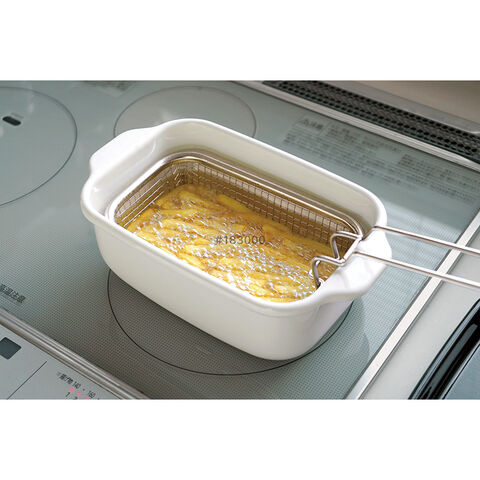角型天ぷら鍋専用バスケット付き。一気に引き上げてフックで油切り。付属品は全て重ねて収納可能なため、省スペースに収まります。