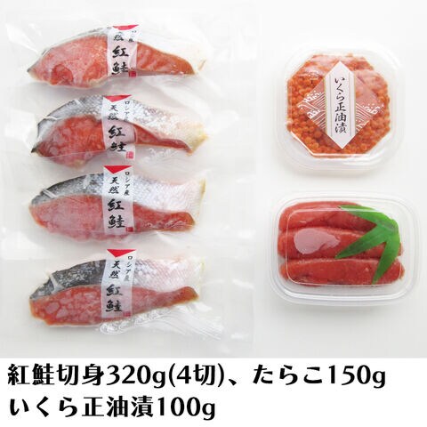 ●商品内容/紅鮭切身 320g(4切)、たらこ 150g、いくら正油漬 100g