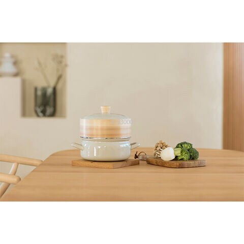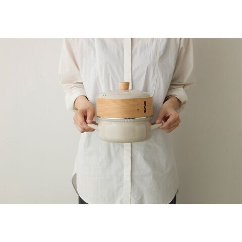 ●商品内容/色=グレージュ サイズ(約)=内径19(取っ手含む幅25.5)×深さ13 せいろ/直径19×深さ7.5cm 容量(約)=2L 素材=ほうろう用鋼板(ほうろう加工) 蓋ツマミ/天然木 せいろ/天然木 スノコ:竹 メッシュシート:シリコーンゴム タイ製(せいろは中国製)
