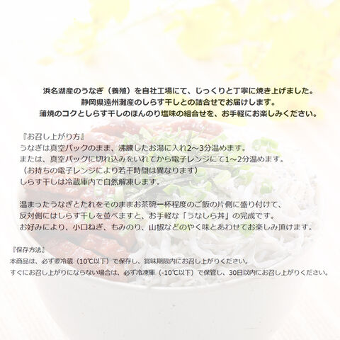 浜名湖産うなぎの細切りと遠州灘産しらす干しで「うなしら丼」。蒲焼のコクとしらすのほんのり塩味がやみつきの組合せです。【商品提供者コメント】