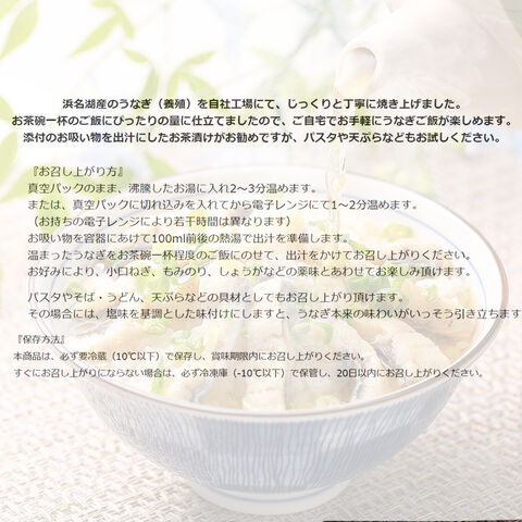 浜名湖産のうなぎ白焼を細切りにしてお茶碗一杯のご飯にぴったりの量に仕立てました。お吸い物はお茶漬けの出汁にお勧めです。【商品提供者コメント】