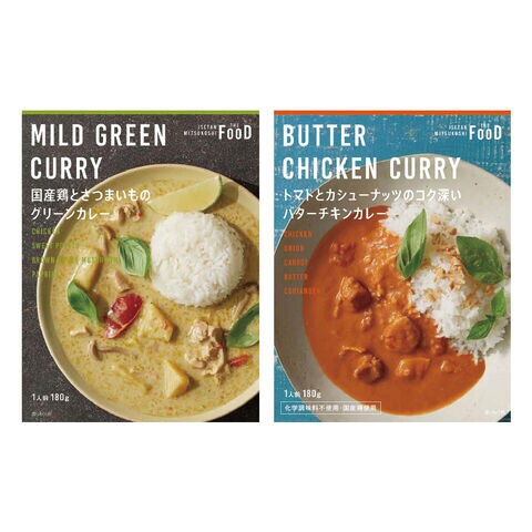 ●商品内容/国産鶏とさつまいものグリーンカレー・トマトとカシューナッツのコク深いバターチキンカレー 各180g