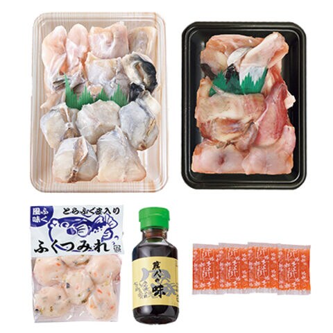 ●商品内容/とらふぐちり300g、あんこう250g、ふぐつみれ80g、ふくポン酢100ml、もみじおろし10g×4