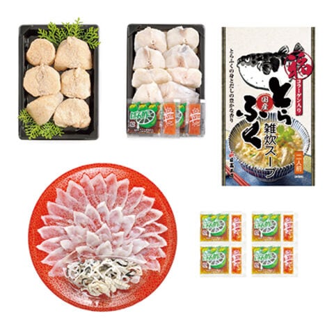 ●商品内容/とらふく刺身60g・とらふく皮湯引き30g(25cmプラスチック皿)、ごまふくちり150g、ごまふく唐揚げ150g、とらふく雑炊スープ340g、(ぽん酢14g・もみじおろし3g)×6