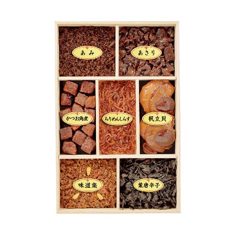 ●商品内容/かつお角煮40g、あみ・あさり・味道楽・ちりめんしらす・葉唐辛子 各30g、大粒帆立2粒