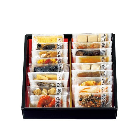 ●商品内容/田作り20g、丹波種黒豆60g、里芋含め煮3個、たたきごぼう70g、にしん一口巻昆布6本、栗きんとん70g、味付しいたけ3枚、穂先竹の子3切、なます50g、焼ほたて3個、だし巻150g、手綱こんにゃく3切、高野豆腐含め煮6切、祝海老2尾、紅白豆マリネ65g、白福豆75g、照焼つくね60g、ぜいたく煮50g
