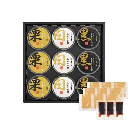 ●商品内容/栗入り黒蜜わらび餅・黒蜜わらび餅 各78g 各3(無糖きな粉付)、白わらび餅74g×3(無糖きな粉・黒蜜付)