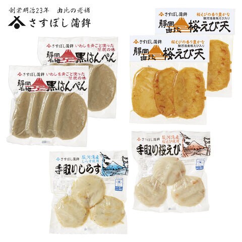 静岡名物黒はんぺんに由比の桜えび・しらすを練り込み、弾力ある食感のかまぼこを詰合せました。【商品提供者コメント】