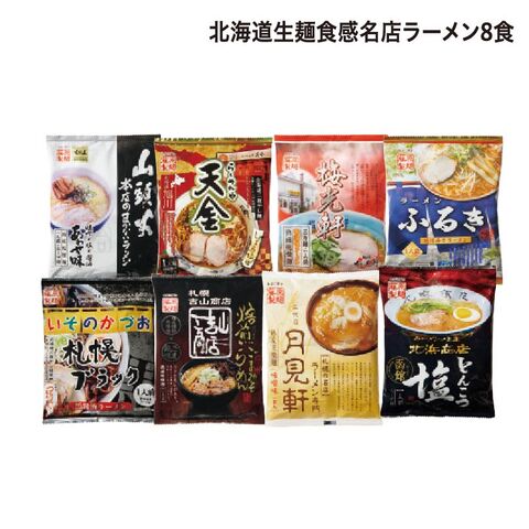 ●商品内容/(1)山頭火 あわせ味(めん70g、スープ57g)、(2)天金 醤油味(めん70g、スープ56g)、(3)梅光軒 醤油味(めん70g、スープ38g)、(4)ふるき 味噌味(めん70g、スープ51g)、(5)札幌ブラック 黒醤油味(めん70g、スープ51g)、(6)吉山商店 ごま味噌味(めん70g、スープ43.5g)、(7)月見軒 味噌味(めん70g、スープ47g)、(8)北浜商店 とんこつ塩味(めん70g、スープ41.5g)