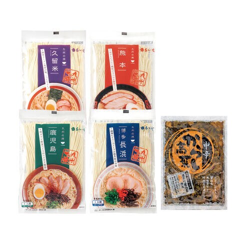 ●商品内容/博多長浜ラーメン・鹿児島ラーメン 各(めん90g、スープ33g)、久留米ラーメン(めん90g、スープ38g)、熊本ラーメン(めん90g、スープ42g)、からし高菜140g