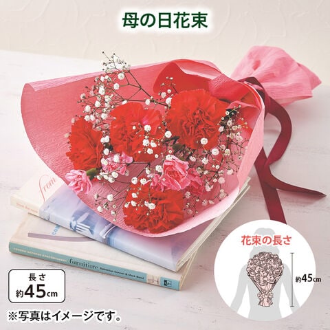 ●商品内容/サイズ(約)=長さ45cm 素材=花材/カーネーション(濃ピンク系4本)、スプレーカーネーション(ピンク系2本)、カスミソウ
