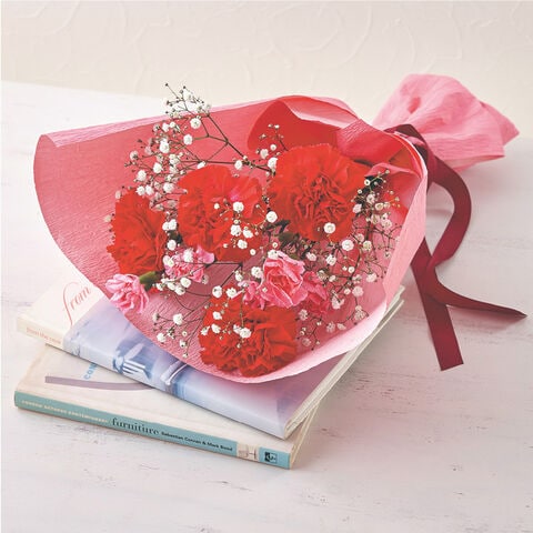 ●商品内容/母の日花束[サイズ(約)=長さ45cm 素材=花材/カーネーション(濃ピンク系4本)、スプレーカーネーション(ピンク系2本)、カスミソウ