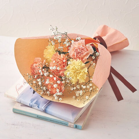 ●商品内容/サイズ(約)=長さ45cm 素材=花材/カーネーション(オレンジ系4本・黄色系2本)、カスミソウ