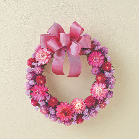 ●商品内容/サイズ(約)=直径18cm 素材=花材/ドライ:ヘリクリサム、千日紅、スターチス リースベース/小枝