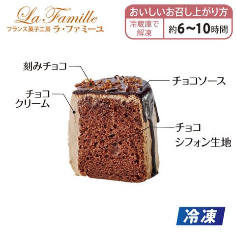 チョコレート風味のふわふわシフォン生地をチョコクリームでデコレーションした上に濃厚チョコレートソースをかけ、刻みチョコをトッピングして仕上げた、チョコづくしのケーキです。【商品提供者コメント】
