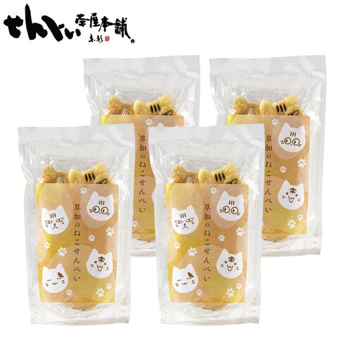 猫型せんべいに4匹の個性的な猫がプリントされています。草加のお煎餅屋さんがつくる、白醤油ベースのせんべいで、味も間違いなし。便利な個包装です。【商品提供者コメント】