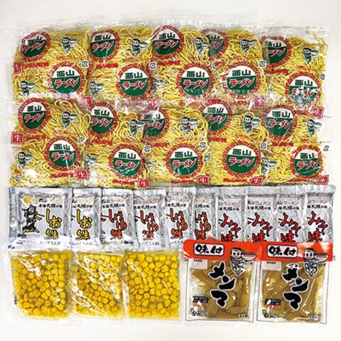 ●商品内容/生めん140g×10、味噌スープ・醤油スープ 各4袋、塩スープ2袋、味付メンマ50g×2、コーン50g×3