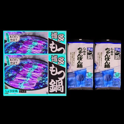 ●商品内容/博多もつ鍋醤油味(牛もつレトルト200g、スープ55g、ガーリックフレーク・唐辛子付)×2、しめの半生ちゃんぽん麺100g×2