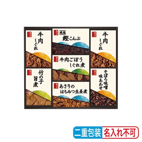●商品内容/牛肉しぐれ50g×2、牛肉ごぼうしぐれ煮・減塩鰹こんぶ・竹の子旨煮 各50g、そぼろ味噌味あわせ90g、あさりのはちみつ生姜煮40g