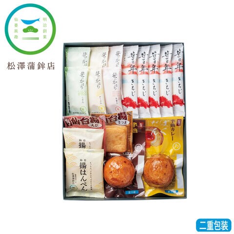 ●商品内容/笹百年きちじ5枚、笹のかほり(チーズ・しそ・生姜 各2枚)、揚はんぺん2枚、仙台揚(さつま・えび 各1枚)、半熟ばくだん・半熟カレーばくだん 各1個