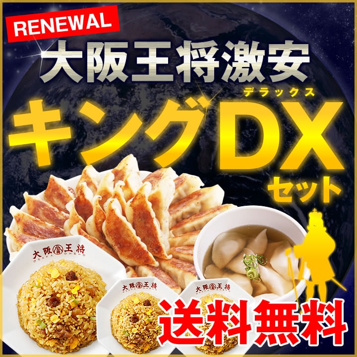 ■激安キングDXセット 【商品内容】 元祖肉餃子×50個 直火炒めチャーハン×2袋(1袋200g) ぷるもち水餃子14~16個入(272g) 餃子のタレ×6袋 【保存方法】冷凍(-18℃以下)保存 【賞味期限】60日以上 【お届け日】ご注文内容確認後、4・5日 ※プレゼント・オマケ商品は同日・同一配送箇所のご注文のみ対象です。 ※オマケの適用について 1注文当たり、3セット以上の場合もオマケは3セット分までとなります