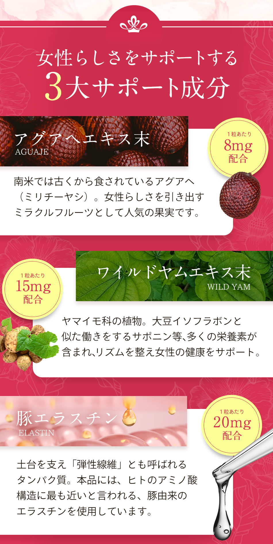 主要原料(1粒あたり):ワイルドヤムエキス末 15mg / アグアヘエキス末 8mg /豚エラスチン 20mg