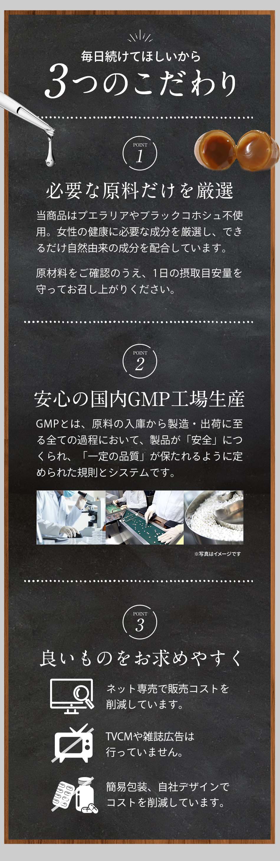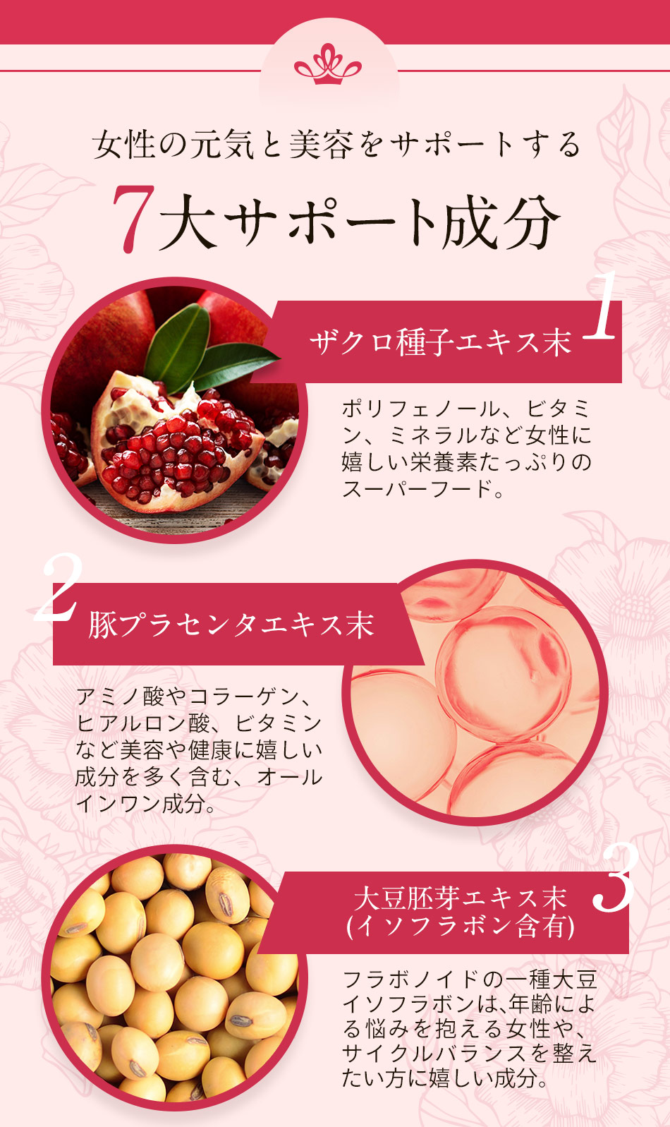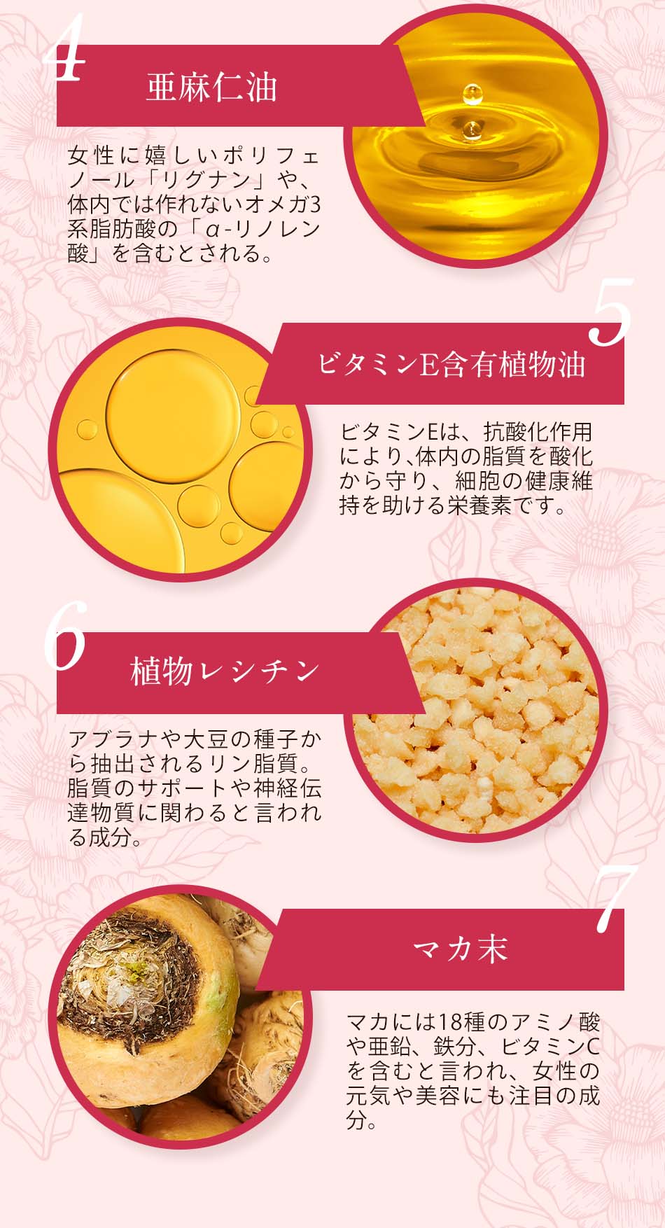 亜麻仁油(ニュージーランド製造)、豚エラスチン、ワイルドヤムエキス末、ザクロ種子エキス末、マカ末、アグアへエキス末、ビタミンE含有植物油、大豆胚芽エキス末(イソフラボン含有)、豚プラセンタエキス末 / ゼラチン、グリセリン、ミツロウ、グリセリン脂肪酸エステル、植物レシチン