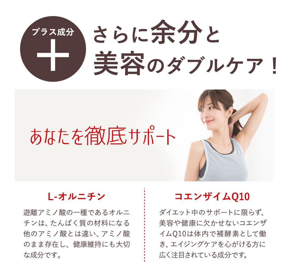 α‐リポ酸(中国製造)、コーンスターチ、でん粉、デキストリン、L-オルニチン、コエンザイムQ10/ゼラチン、ステアリン酸Ca、ビタミンC、微粒酸化ケイ素、抽出ビタミンE