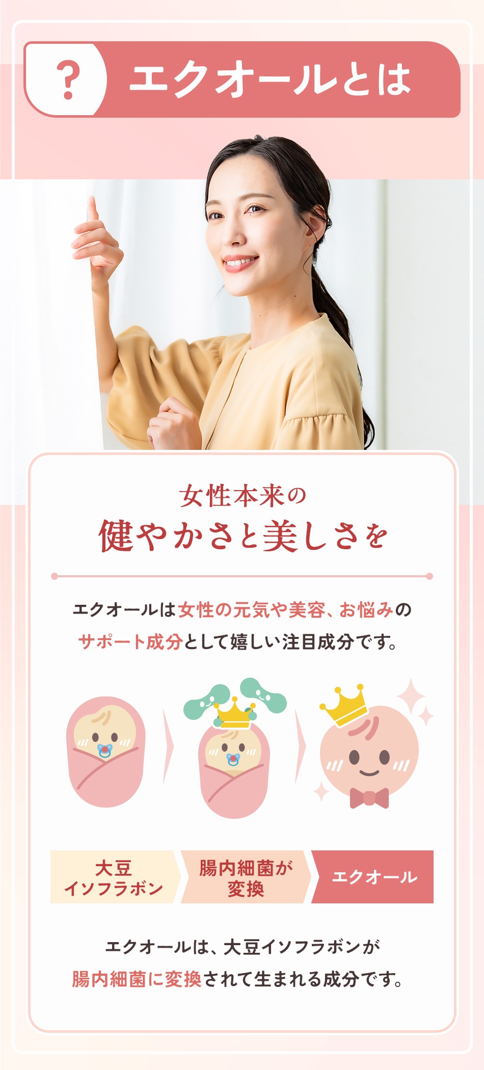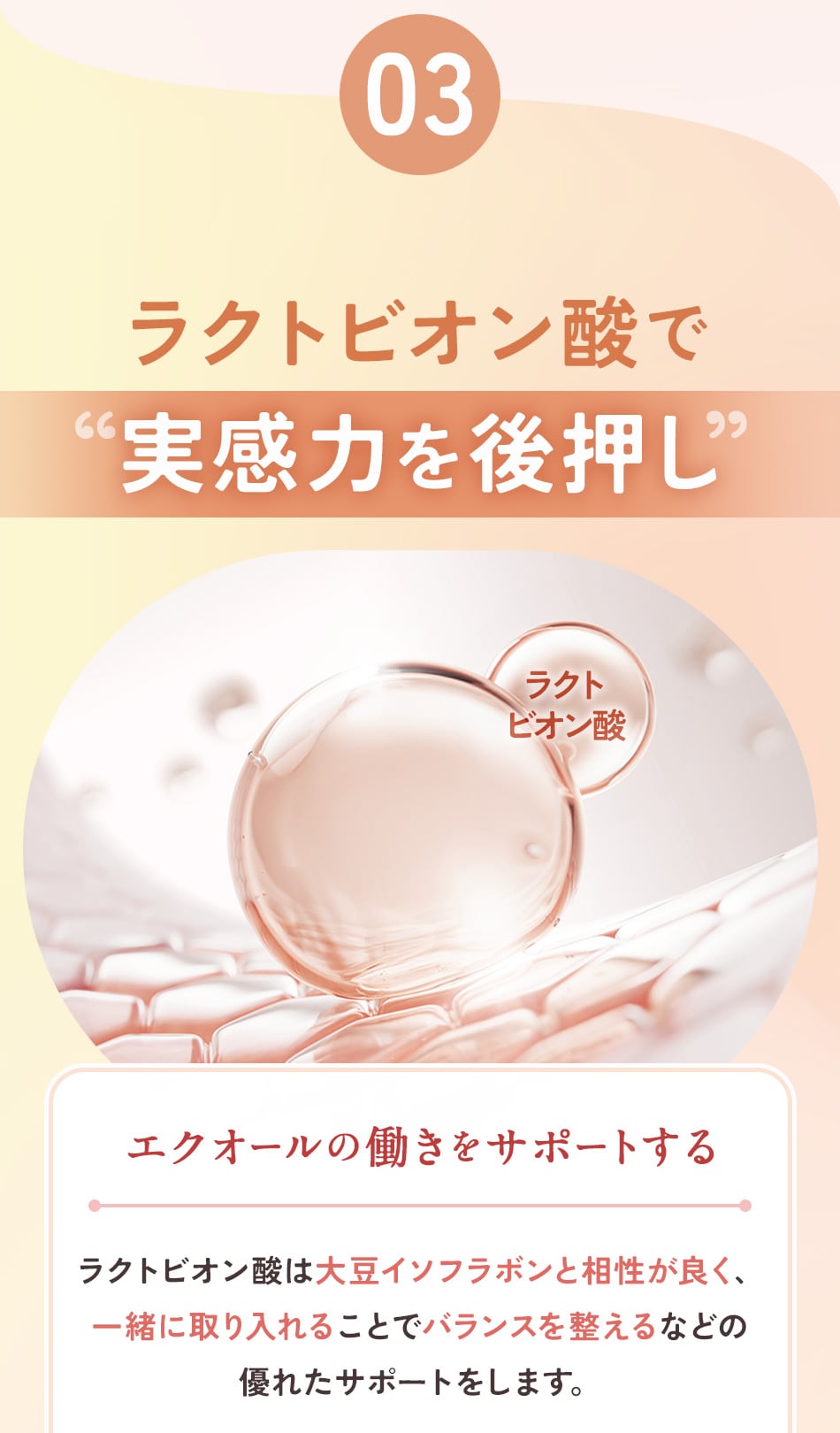 大豆胚芽抽出発酵物(大豆を含む)(国内製造)、乳糖発酵物(乳成分を含む)/結晶セルロース、ゼラチン、ステアリン酸カルシウム、二酸化ケイ素