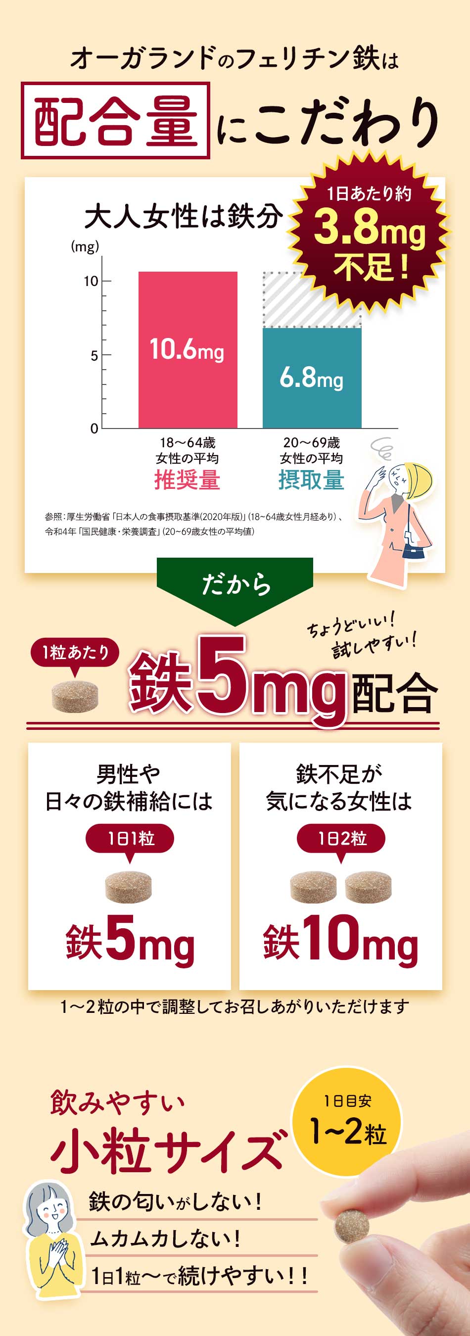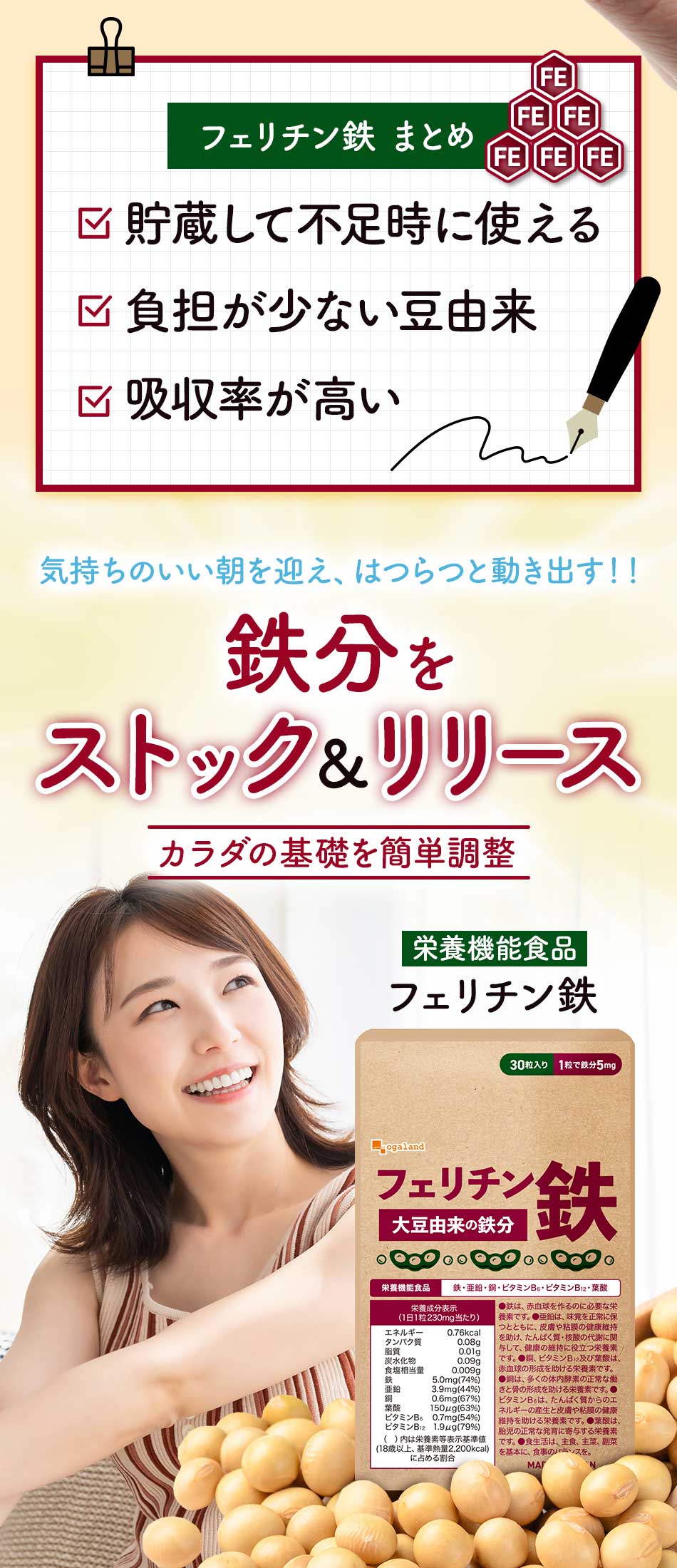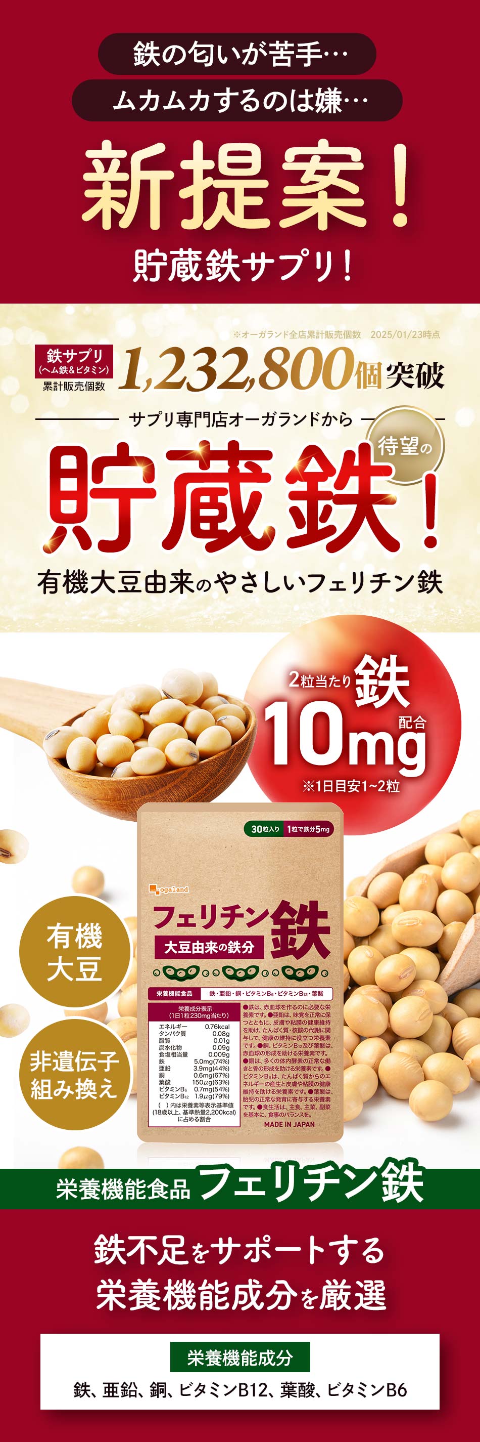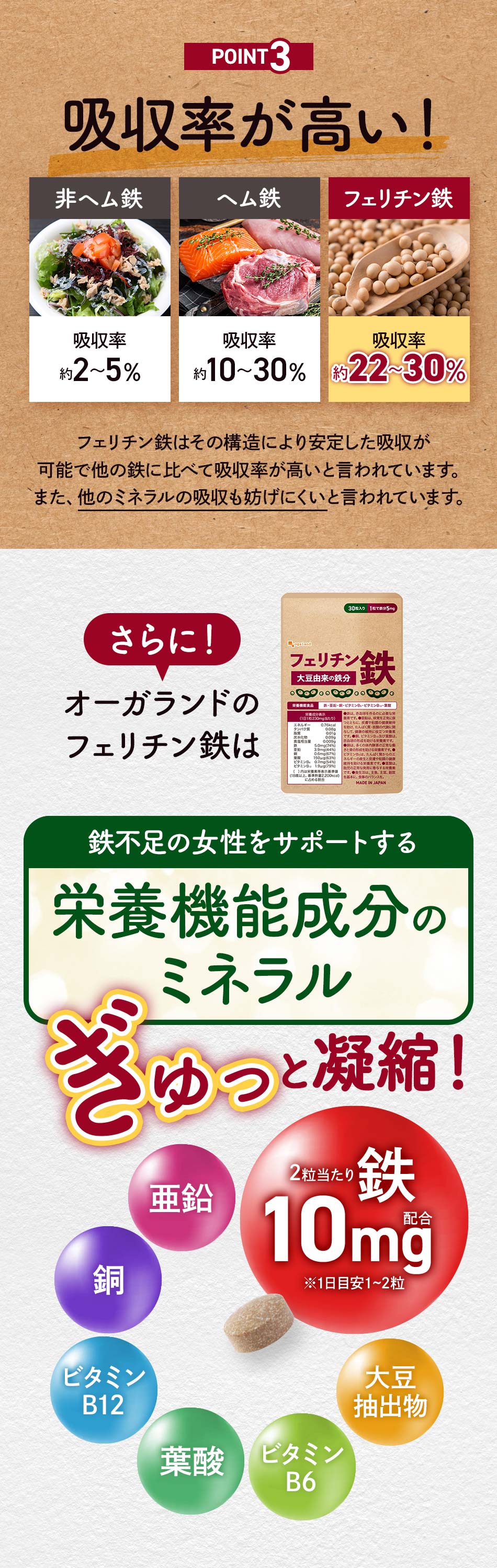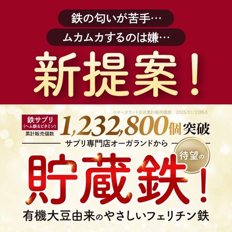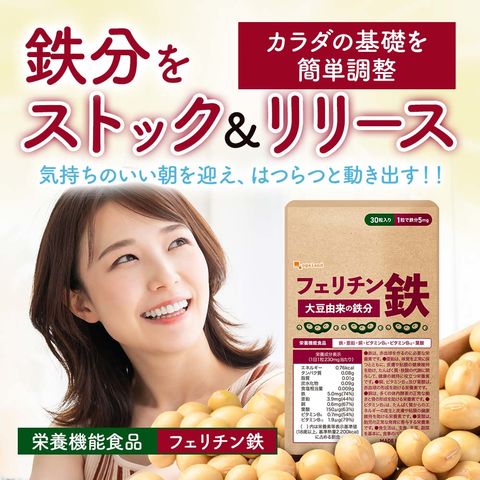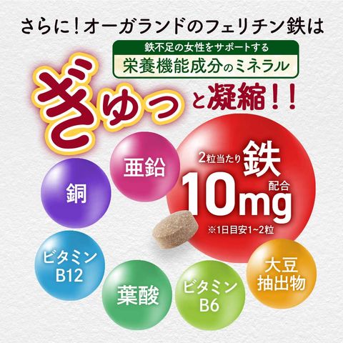 フェリチン鉄 (約1ヶ月分) 鉄 鉄分 サプリ 栄養機能食品 貯蔵鉄 オーガランド 女性 亜鉛 銅 葉酸 ビタミンB6 ビタミンB12 非ヘム鉄 小粒 1粒あたり5mg 高吸収 有機 大豆由来 サプリメント