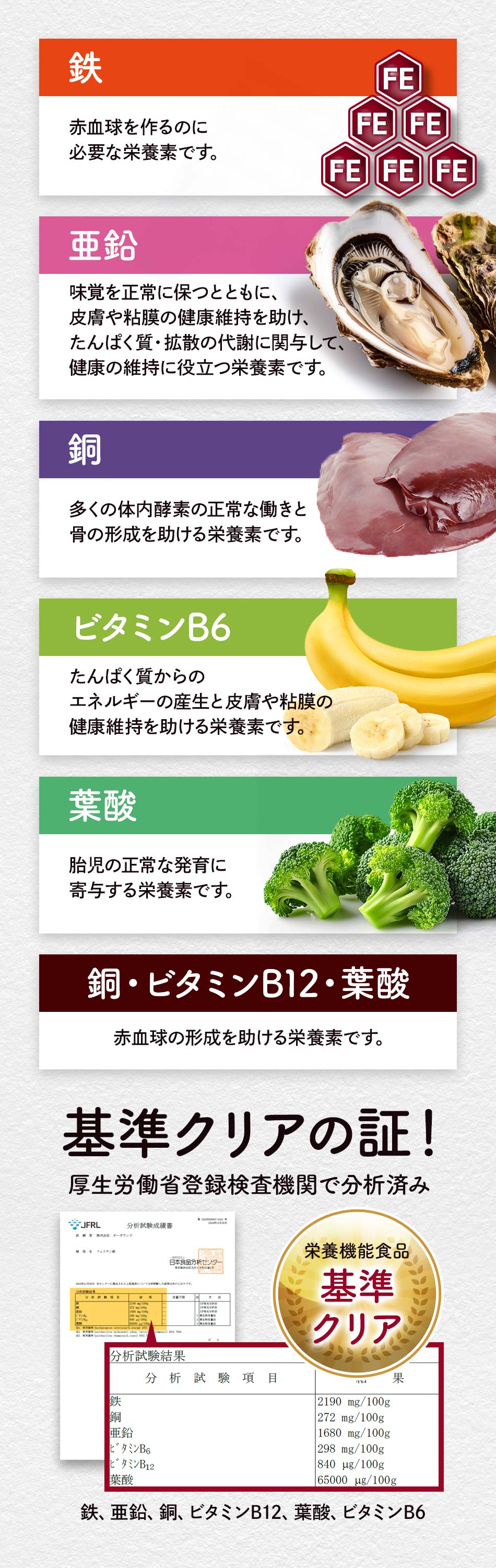 栄養機能食品(鉄・亜鉛・銅・ビタミンB6・ビタミンB12・葉酸)