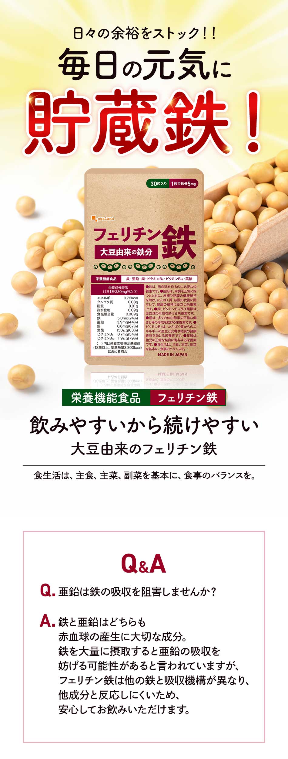 主要原料(1粒あたり):大豆抽出物 100mg / 亜鉛酵母 40mg /葉酸酵母 10mg / グルコン酸銅 5mg