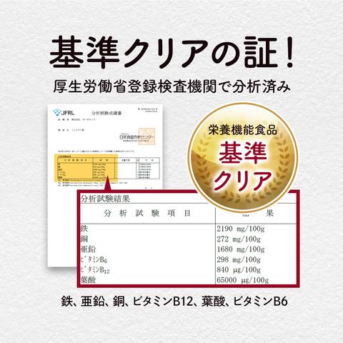 (対象年齢18 歳以上、基準熱量2,200kcal)に占める割合:鉄 74% 亜鉛 44% 銅 67% ビタミンB6 54% ビタミンB12 79% 葉酸 63%