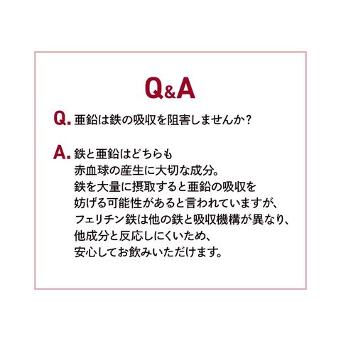 鉄は、赤血球を作るのに必要な栄養素です。亜鉛は、味覚を正常に保つのに必要な栄養素です。亜鉛は、皮膚や粘膜の健康維持を助ける栄養素です。亜鉛は、たんぱく質・核酸の代謝に関与して、健康の維持に役立つ栄養素です。銅、ビタミンB12及び葉酸は、赤血球の形成を助ける栄養素です。銅は、多くの体内酵素の正常な働きと骨の形成を助ける栄養素です。ビタミンB6は、たんぱく質からのエネルギーの産生と皮膚や粘膜の健康維持を助ける栄養素です。葉酸は、胎児の正常な発育に寄与する栄養素です。