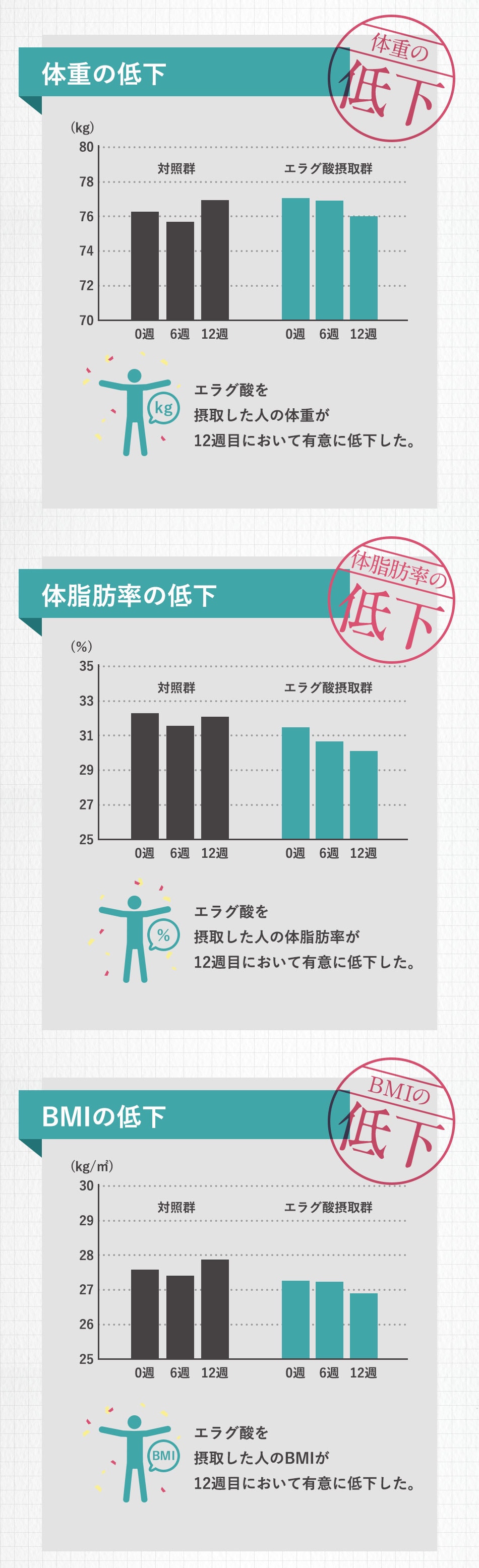 本品にはエラグ酸が含まれています。エラグ酸は肥満気味の方の体重、体脂肪、血中中性脂肪、内臓脂肪、ウエスト周囲径の減少をサポートし、高めのBMI値の改善に役立つことが報告されています。肥満気味の方、BMI値が高めの方に適した商品です。