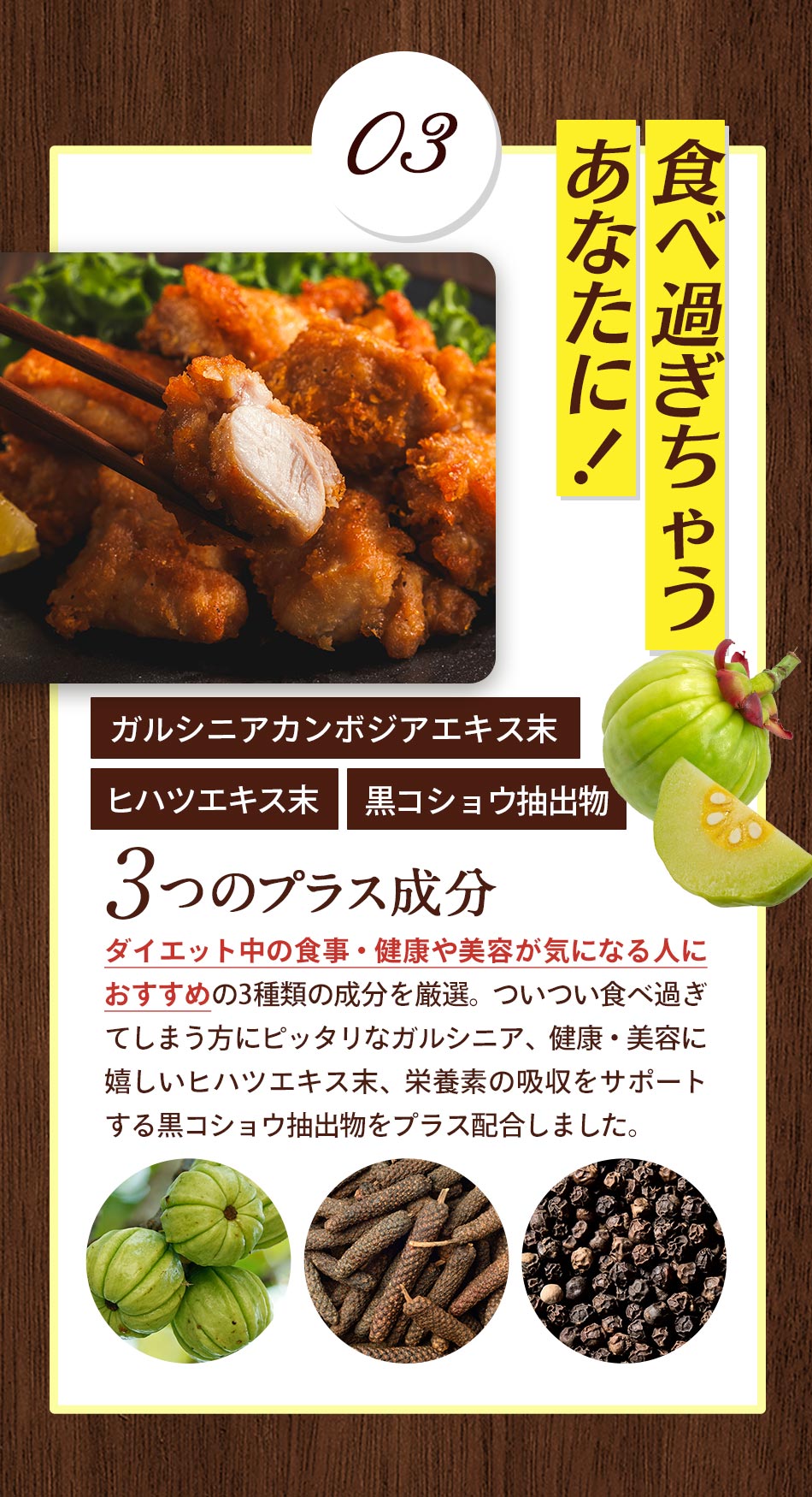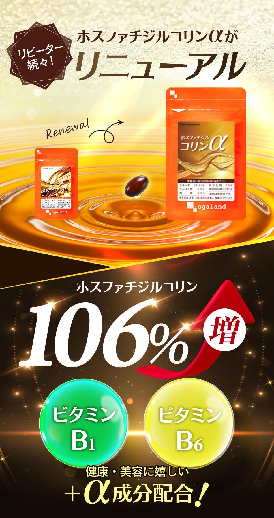 アマニ油(国内製造)、大豆レシチン抽出物、大豆油、ガルシニアエキス末、黒胡椒抽出物、ヒハツ抽出物(デキストリン、ヒハツエキス)/ゼラチン、グリセリン、ミツロウ、グリセリン脂肪酸エステル、L-ヒスチジン、カラメル色素、ビタミンB6、ビタミンB1、香辛料抽出物